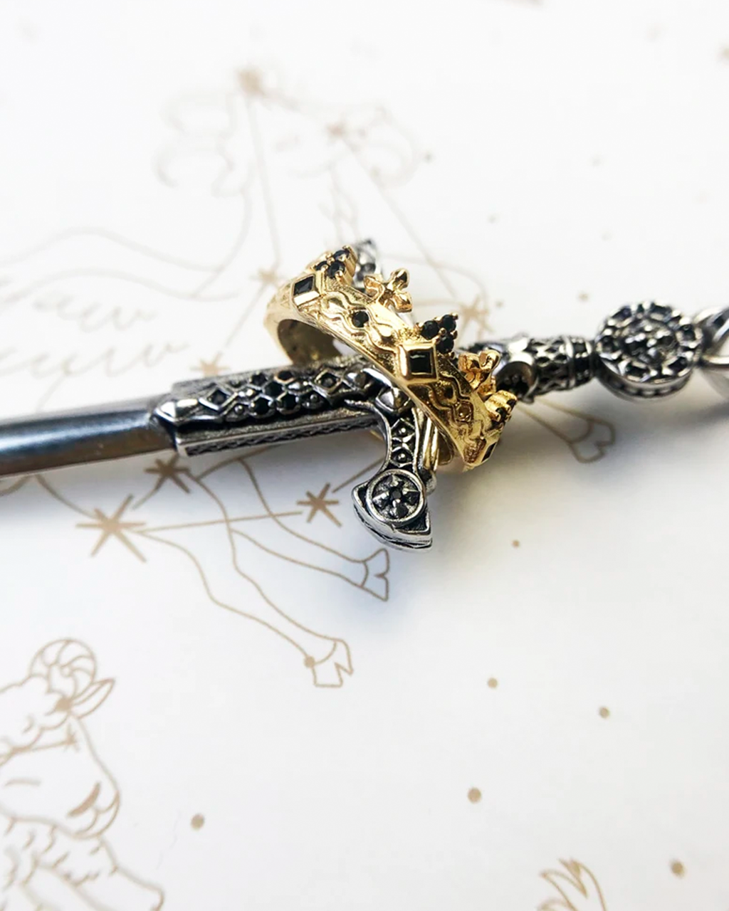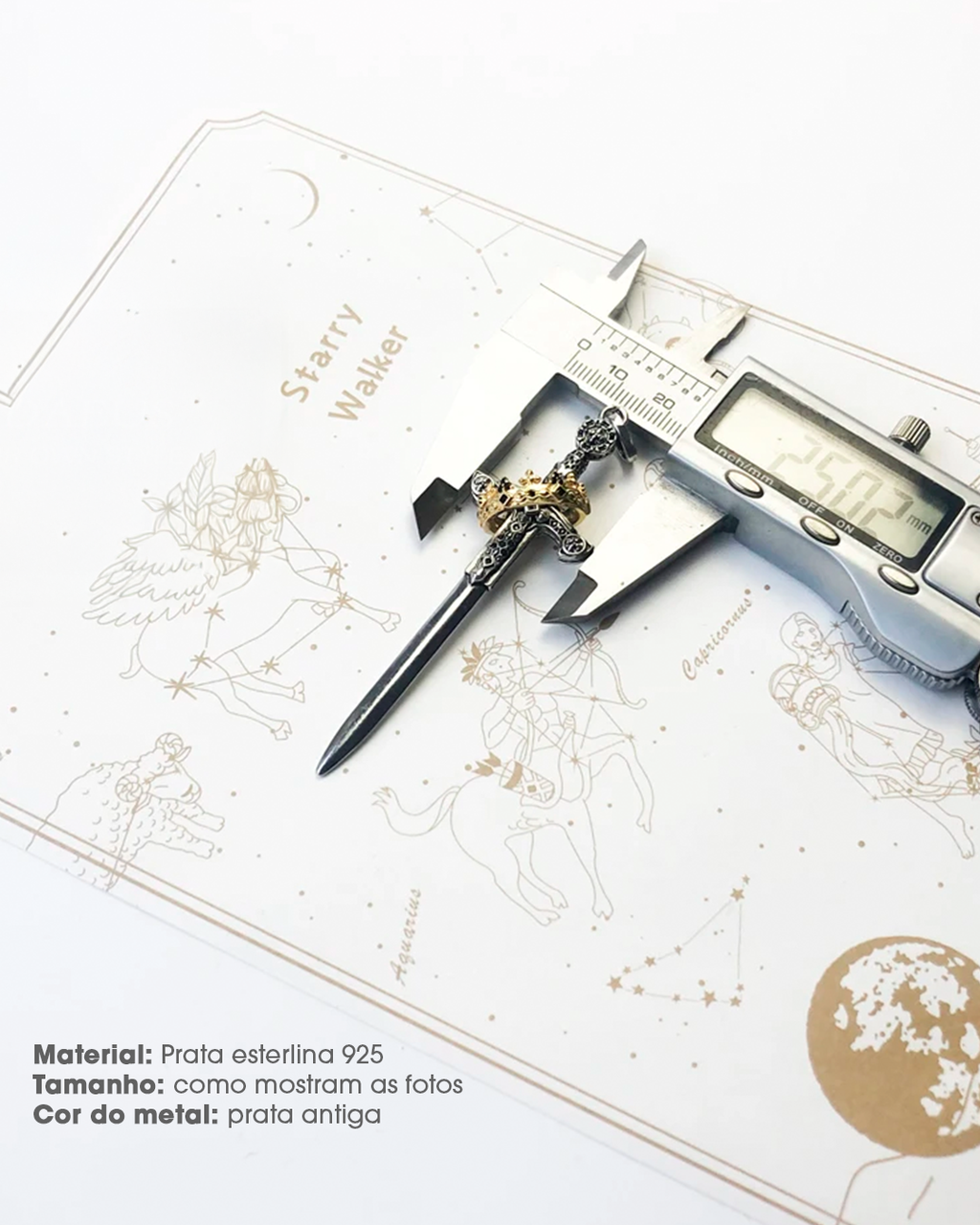 Forjado em prata esterlina 925, ele traduz a essência dos caçadores que enfrentam a escuridão. Seu design une a força de uma espada medieval à imponência de uma coroa dourada, representando vitória, disciplina e liderança implacável.