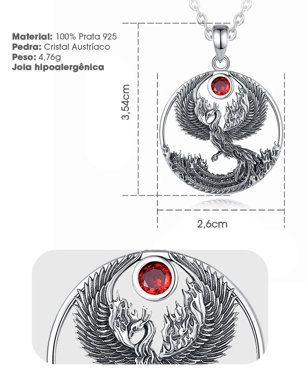 Forjado em prata esterlina 925, ele traz a imagem da lendária fênix em chamas — símbolo eterno de quem cai, mas retorna ainda mais forte.